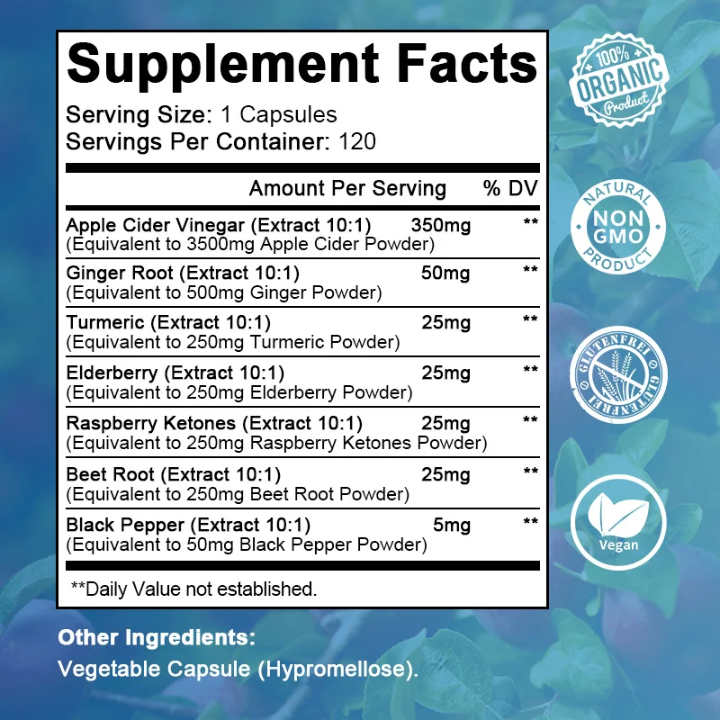 Discover the power of apple cider vinegar in convenient capsule form. Our ACV Capsules support weight management, detoxification, digestion, and energy without the taste or acidity of traditional vinegar.